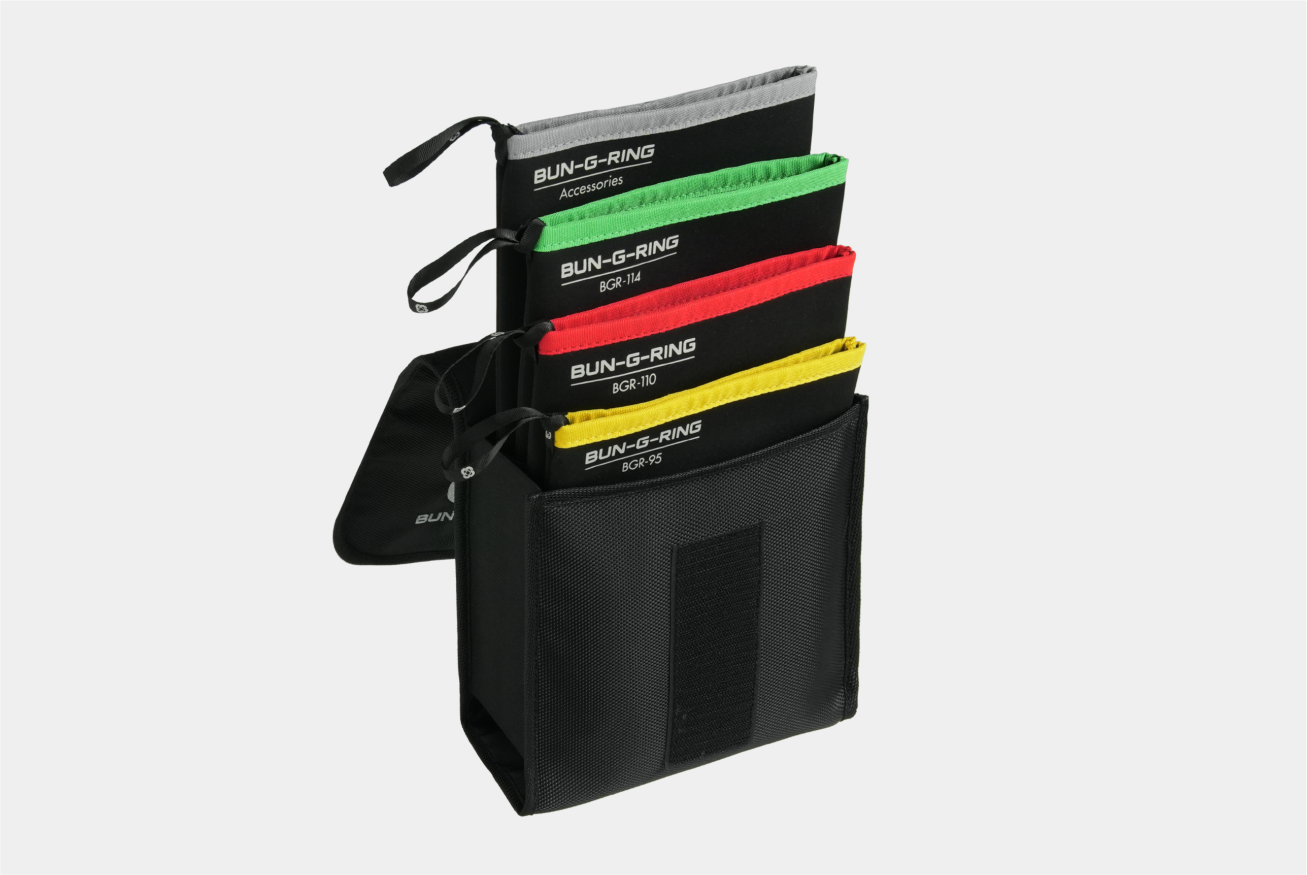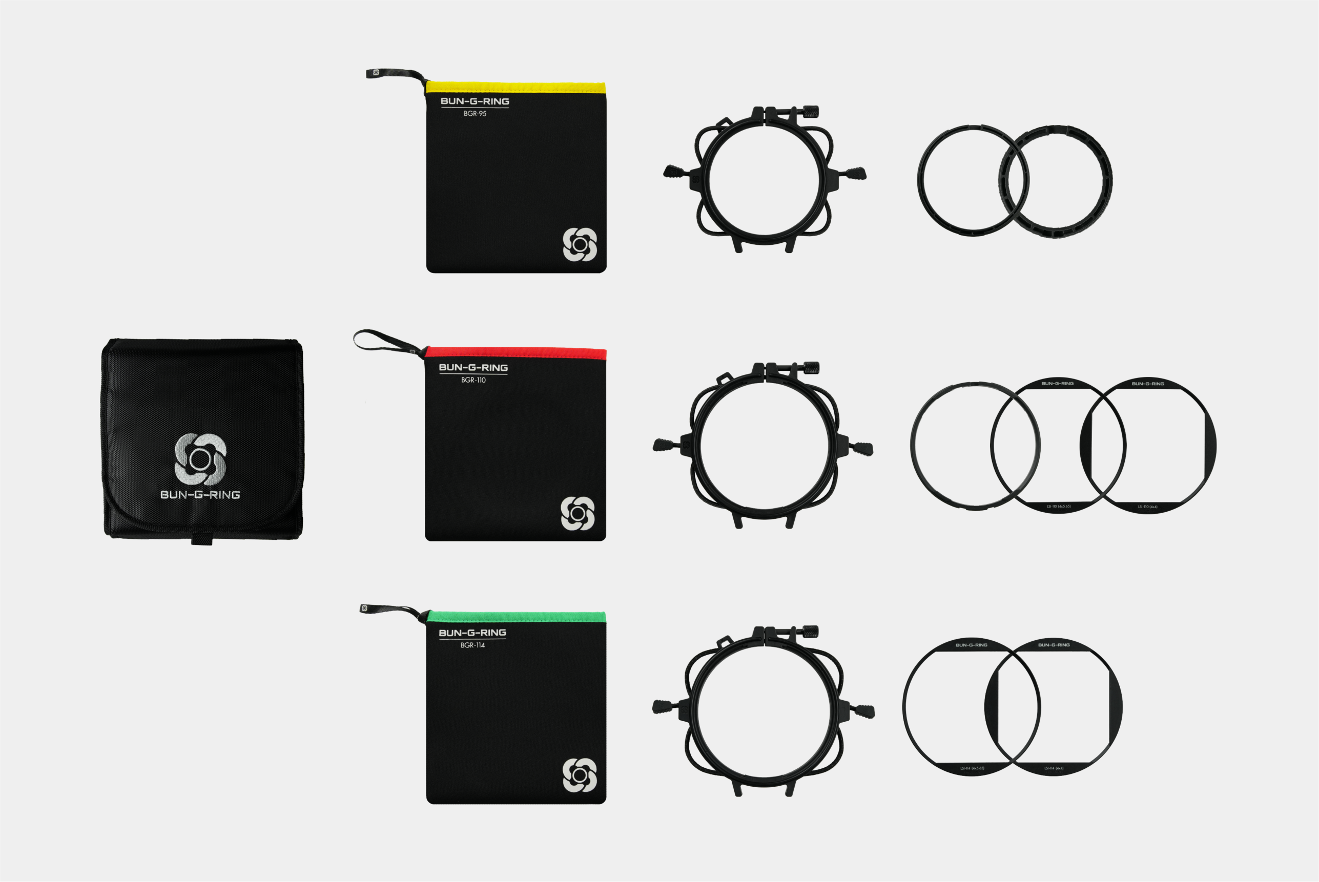 This full set contains three color-coded Bun-G-Rings with accessories, neoprene sleeves, and a carrying pouch. It's compatible with over 1000 cinema lenses with the following front diameters: