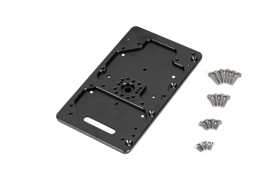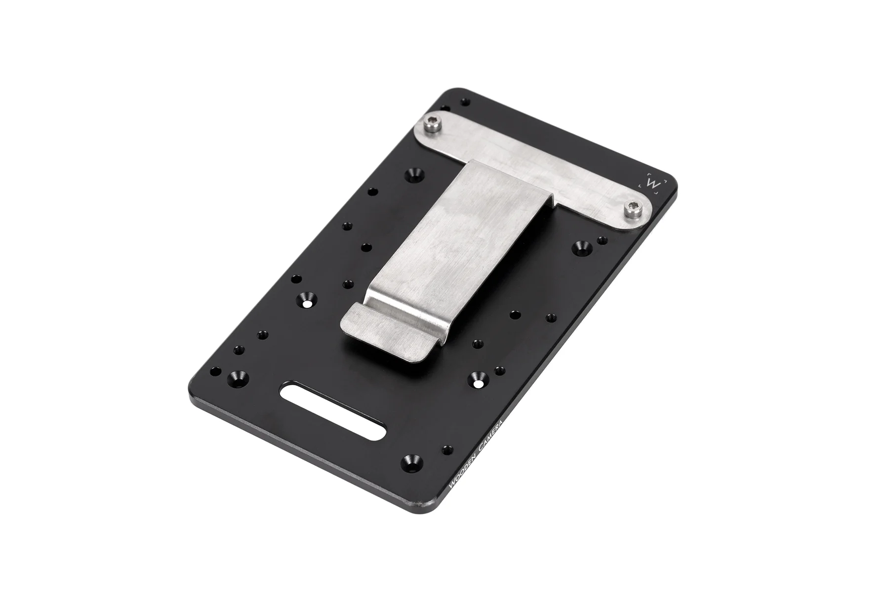 Battery Belt Clip Mounting Plate provides mounting points to attach V-Mount, Gold Mount, and RED®/Blueshape style battery plates. Stainless steel clip is attached to the back for hooking onto belts, pockets, etc. Great for use with gimbals.