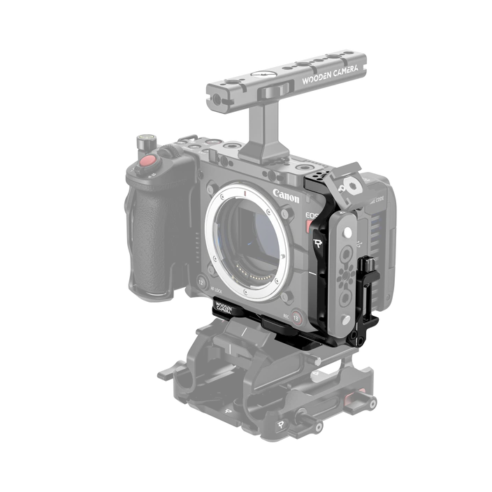 The Cage L-Bracket for Canon EOS C50 securely attaches to the bottom and operator side of the camera, providing a stable interface for mounting to baseplates. It includes a removable HDMI clamp, secured via two screws, to protect connected cables and maintain a clean, reliable setup.