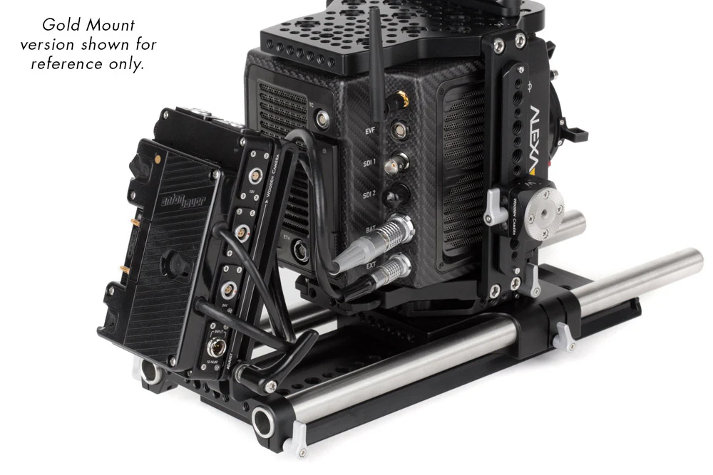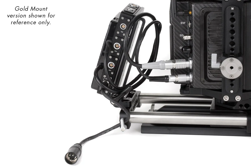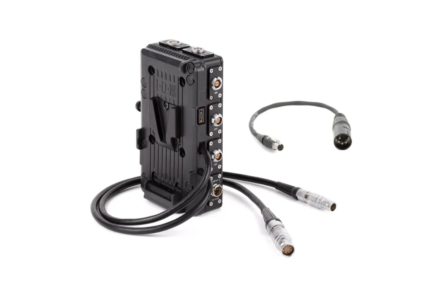 D-Box (Alexa Mini / Mini LF, V-Mount) is a custom version of our popular D-Box that adds power distribution, standardized remote start/stop, and hot swap abilities for the ARRI Alexa Mini and Mini LF camera. Allows for up to 4 simultaneous outputs with a maximum draw of 3A per output (24V outputs 3A max combined) and 10A total draw limited by an easily accessible fuse. Two 16 inch (40cm) cables exit the power plate with one going to the 8pin power plug and the other going to the 7pin EXT port.