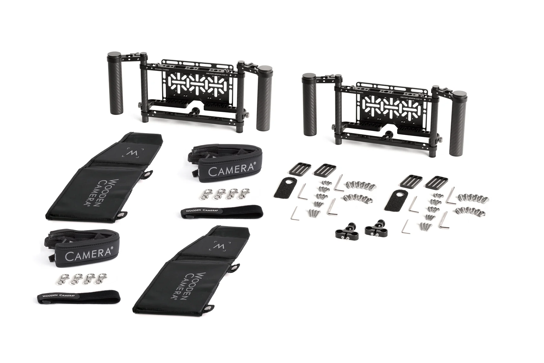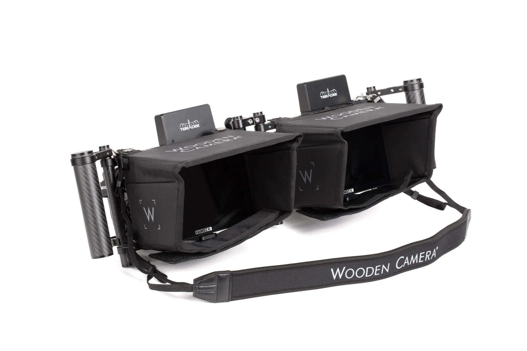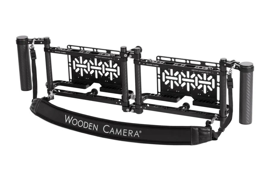 The Dual Director's Monitor Cage v3 is engineered to be universally compatible with any monitor up to 9 inches (measured diagonally) and attaches via top, bottom, or rear 1/4-20 mounting locations. New design provides 33% weight reduction compared to the previous model and adds unique new features like a dual direction swing away bracket, quick release neck strap, dual Teradek mounting areas, and carbon fiber rods and handles.