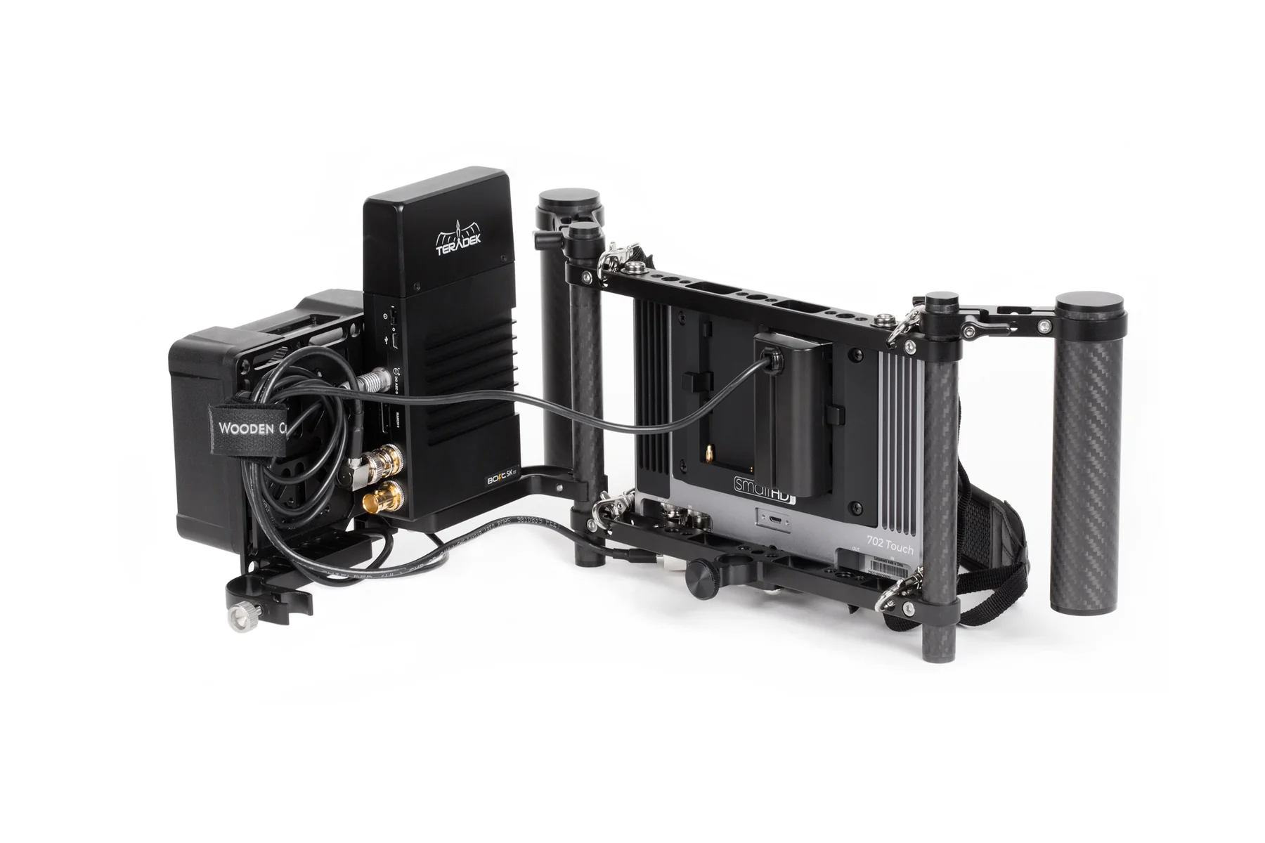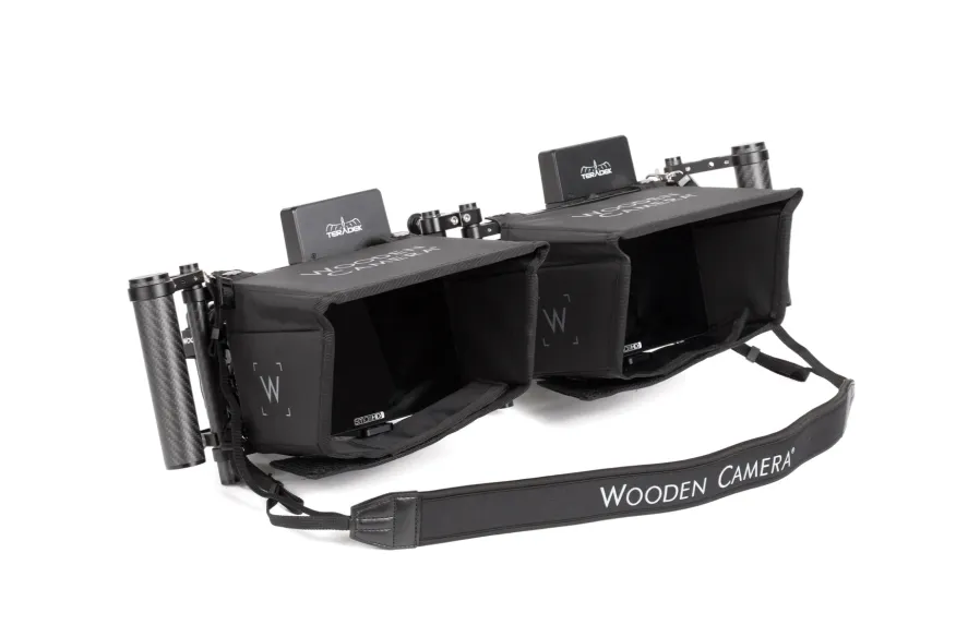The tool-less design of the handles allow them to be folded in for easy packing and the sun shade can be repurposed to act as a protective cover. Also included is a padded neck strap with 4 mounting points and quick release clips, Teradek mounting areas that allow up to two wireless receivers to be mounted side by side, and a cable tie for cable management.