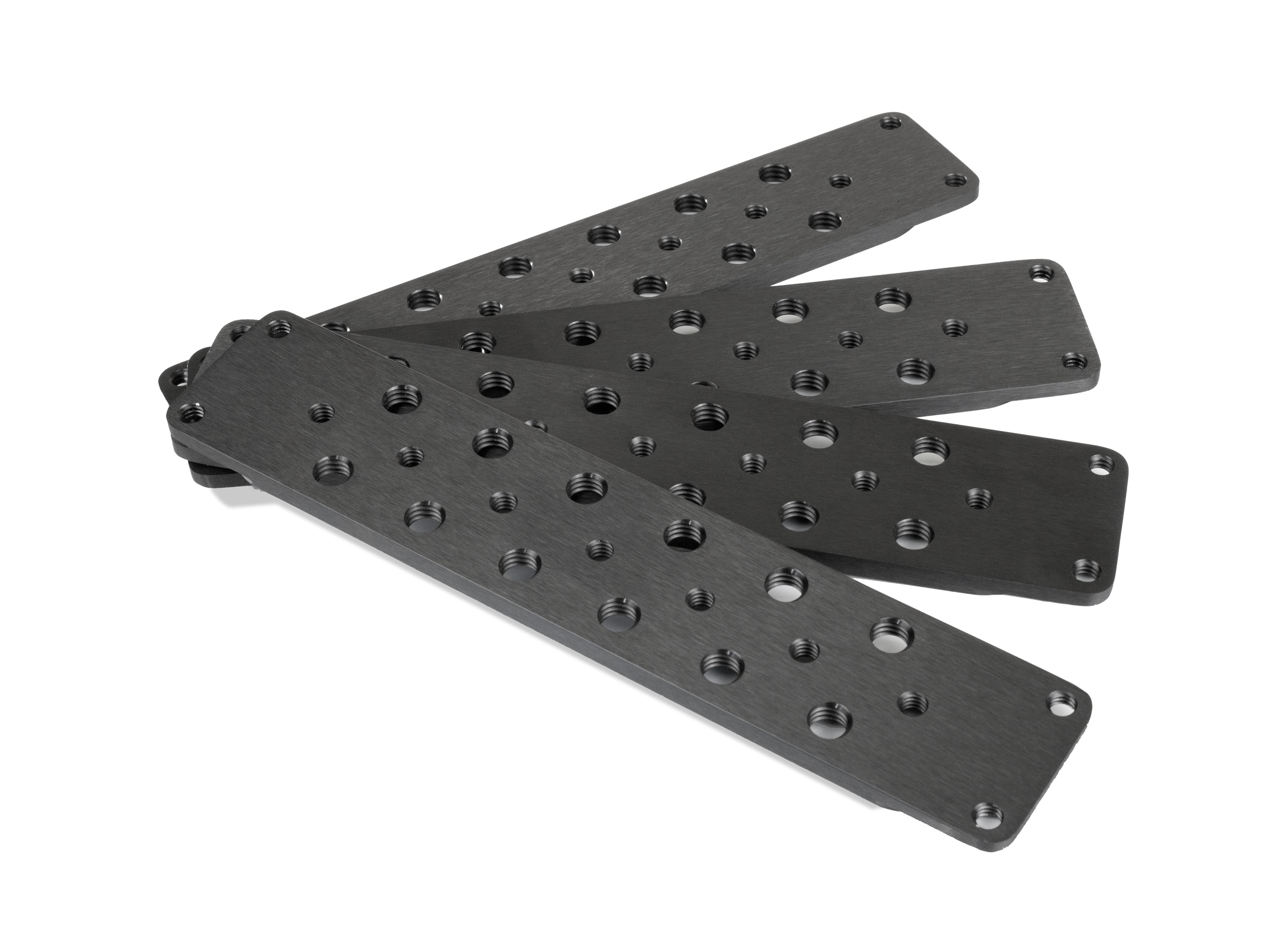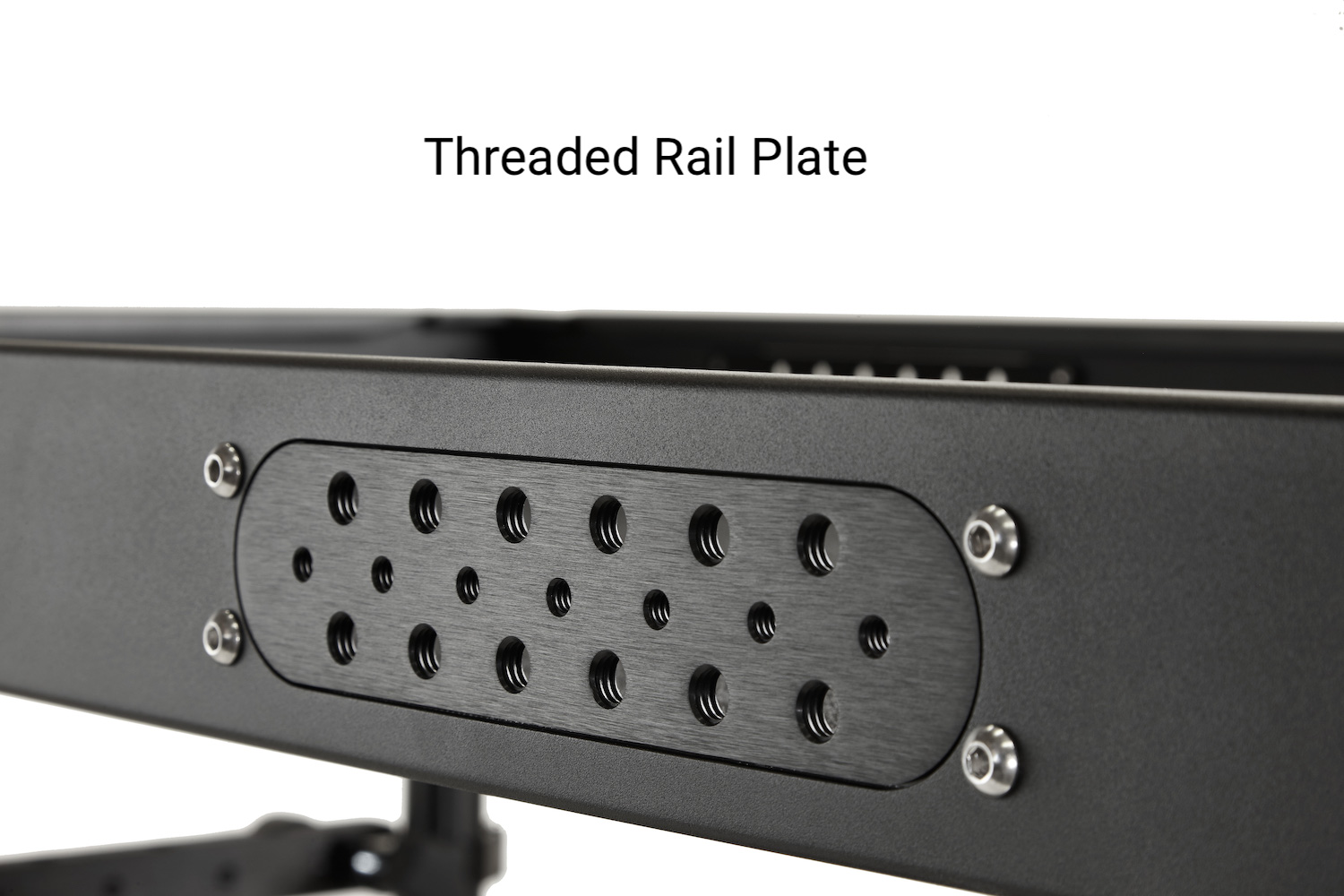 Four replacement Integrated Threaded Rail Plates for Voyager workstation carts. The plates feature a combination of 1/4"-20 and 3/8"-16 threaded holes, offering versatile mounting options for additional accessories and various third-party products.