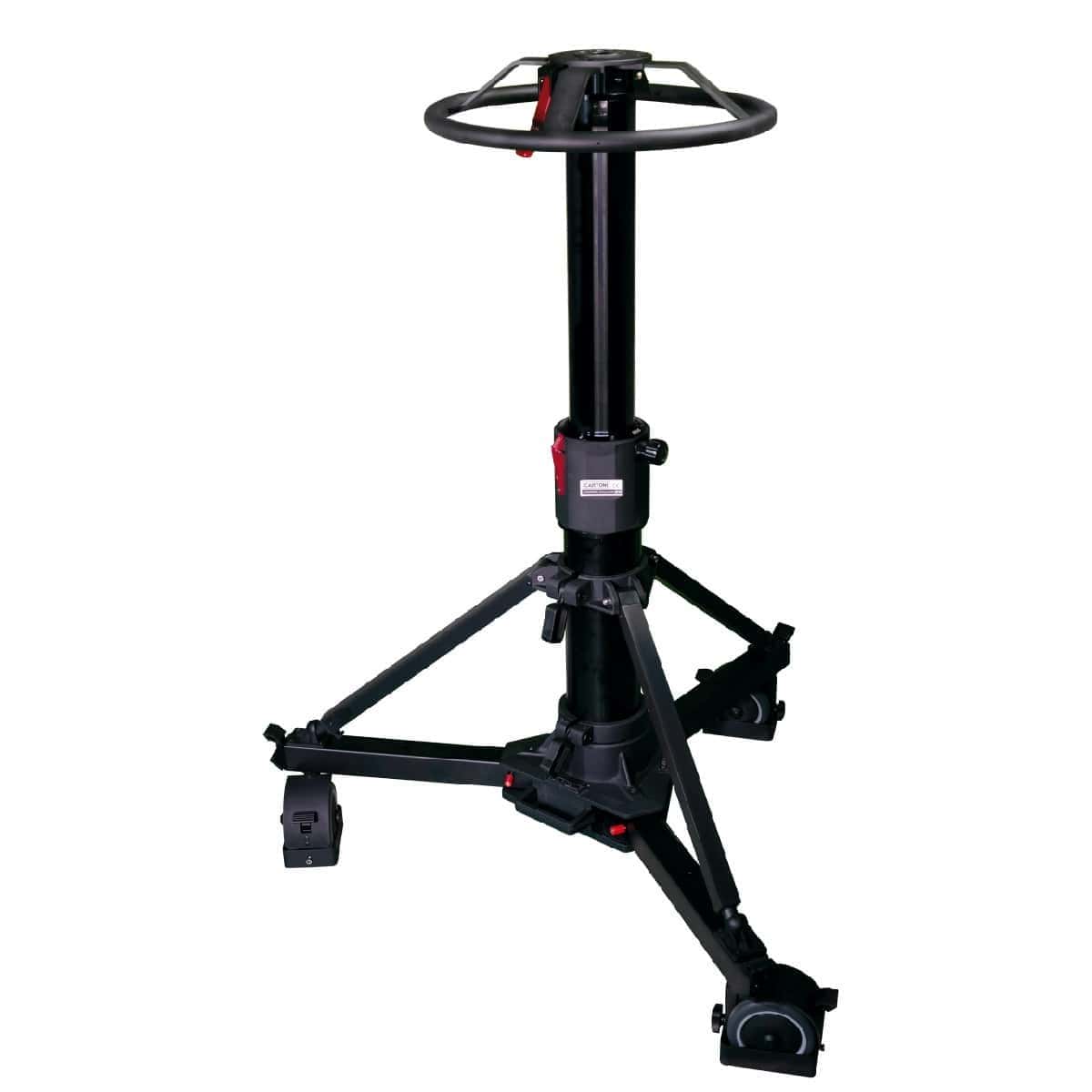 On the foldable dolly, six position track lock, foot operated brake on each of the 125 mm twin wheels and cable guards provide smooth movements in any desired direction.