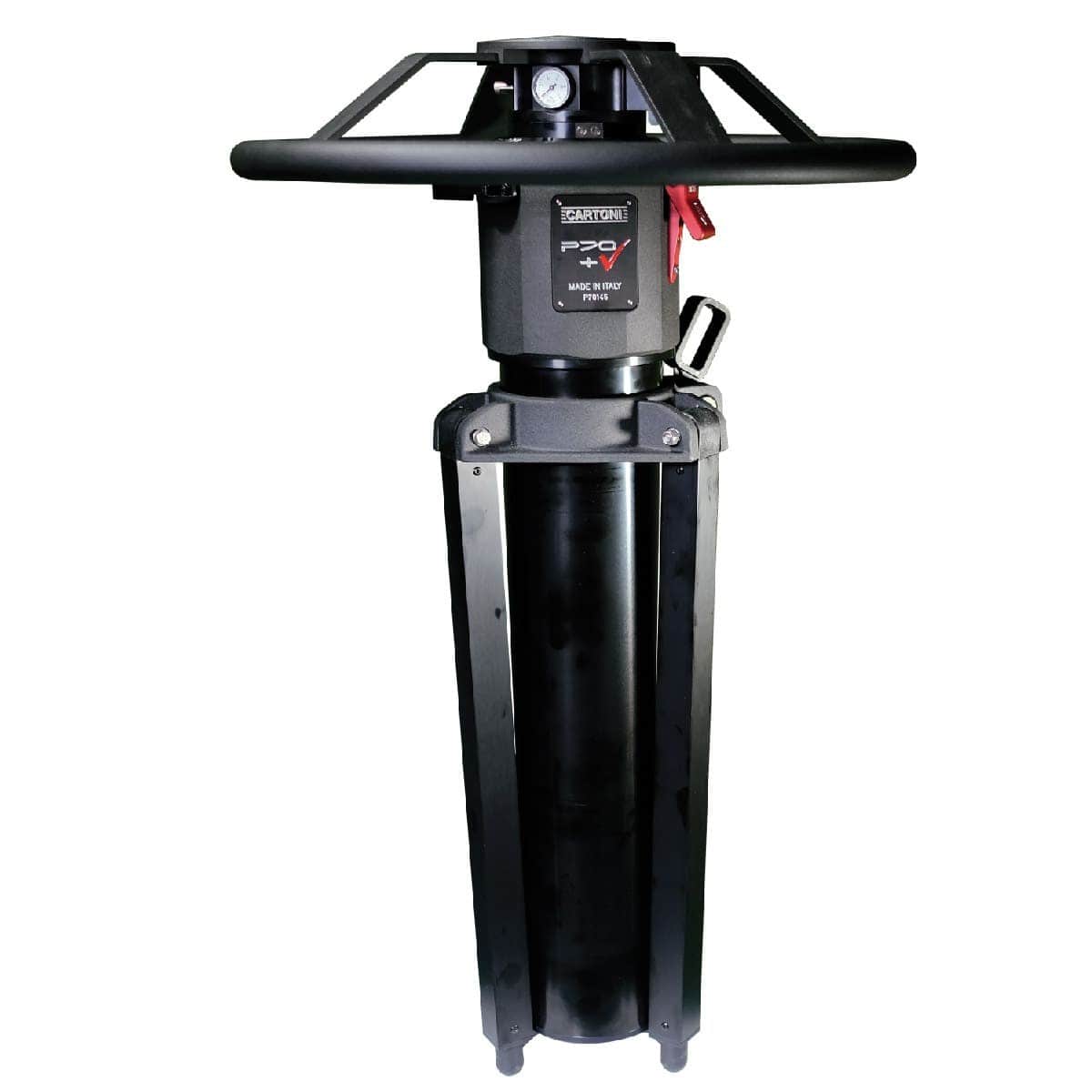 The column is firmly secured to the dolly by a double clamp, easily engaged by two ergonomic locking levers.