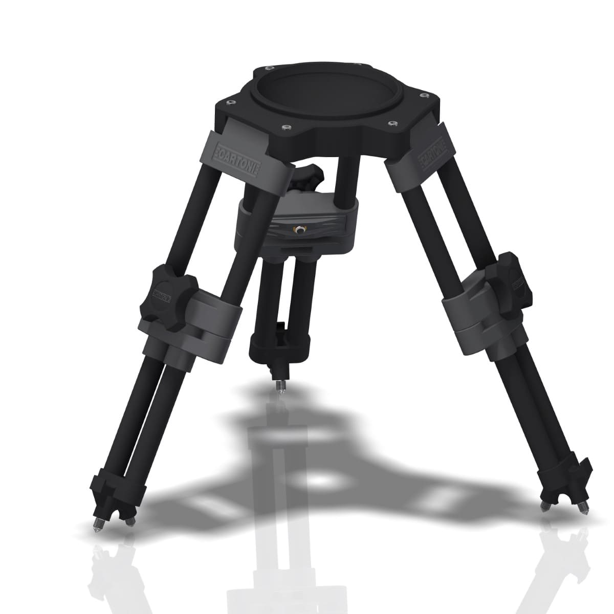 All Studio tripods are geared to mount an array of Cartoni accessories such as mid-level, ground spreaders, and dollies to operate in the widest variety of environments. (When assembled with mid-level spreader, requires pivoting tripod feet)