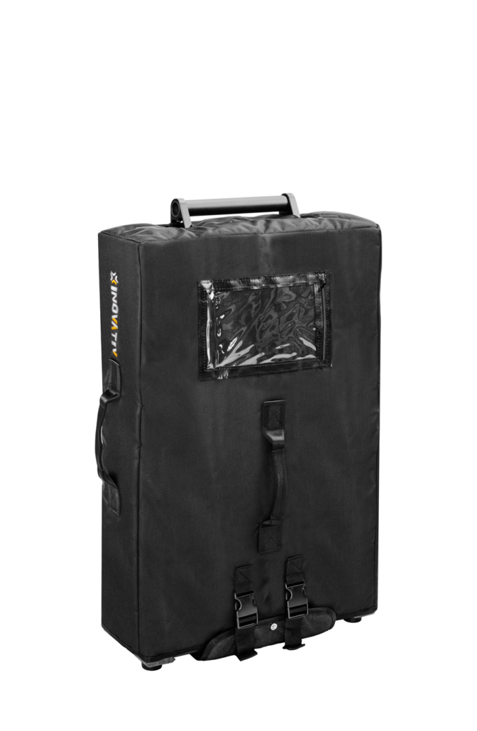 Voyager Travel Case is an essential accessory for air travel with your Voyager cart. It provides superior protection to the cart and the aluminum dovetail system, guarding against scratches and minor dings. The front of the case features a shipping label pocket, while a business card pocket is located on the side. Two heavy-duty lifting handles provide convenience during transport.
