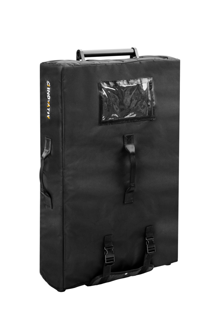 Voyager Travel Case is an essential accessory for air travel with your Voyager cart. It provides superior protection to the cart and the aluminum dovetail system, guarding against scratches and minor dings. The front of the case features a shipping label pocket, while a business card pocket is located on the side. Two heavy-duty lifting handles provide convenience during transport.