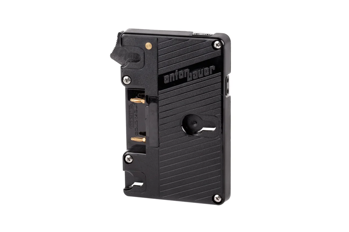 Wooden Camera brand Gold Mount plate utilizing an Anton Bauer Mount. Plate provides unregulated 12V power (12-16V depending on battery connected) via two D-Taps.