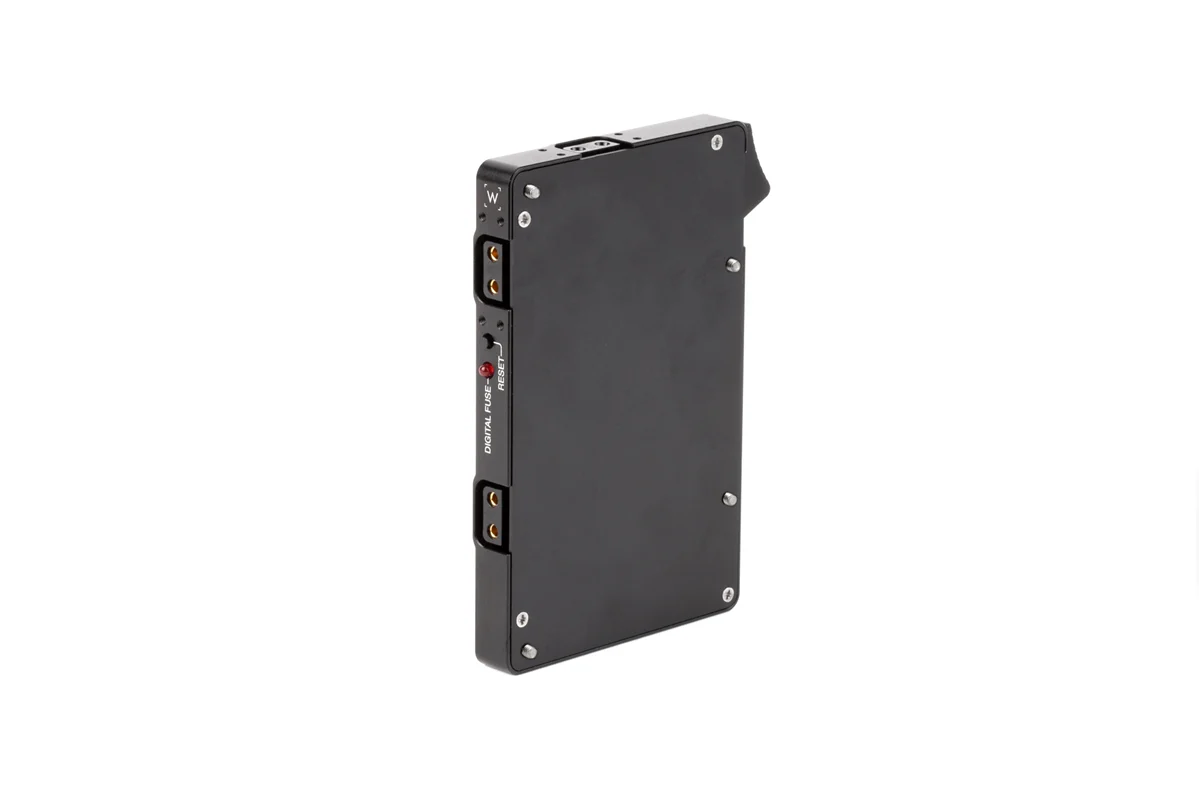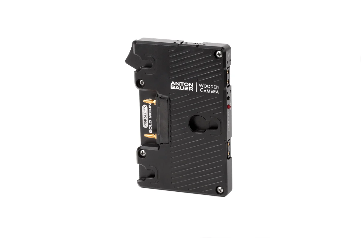 Wooden Camera brand Pro Gold Mount plate is a metal power plate, created in partnership with Anton Bauer, and has a rugged aluminum body for durability and secure battery mounting. Features 3x D-Taps for accessory power at battery voltage (12-16V), a digital fuse with reset button, rear cover plate, and captive mounting screws. Should the user exceed the set current for accessories, only the accessory outputs are disabled leaving the camera running normally. Once the current load has been reduced by either removing accessories or reconfiguring, the reset button can be pressed to enable accessory power again.