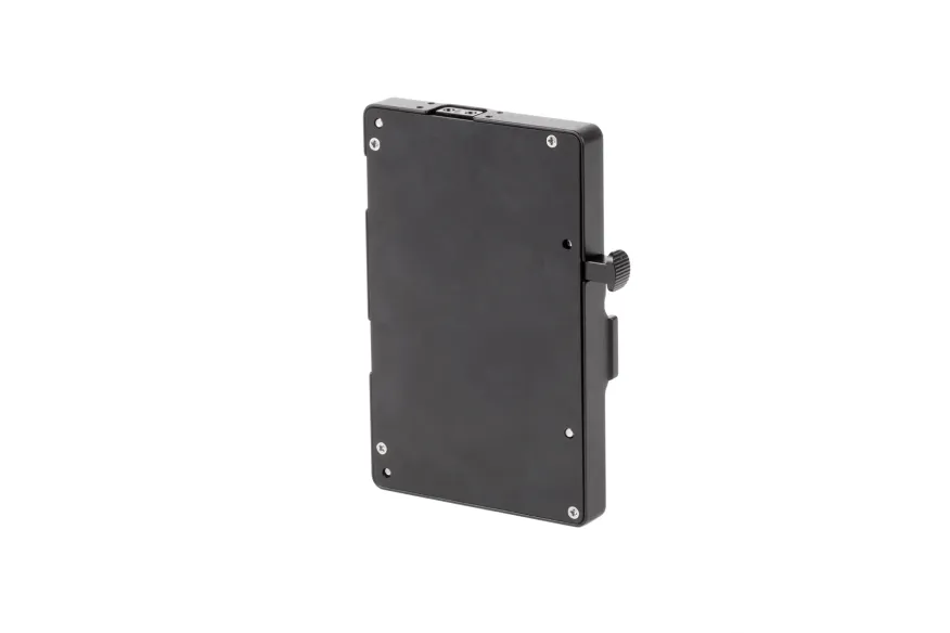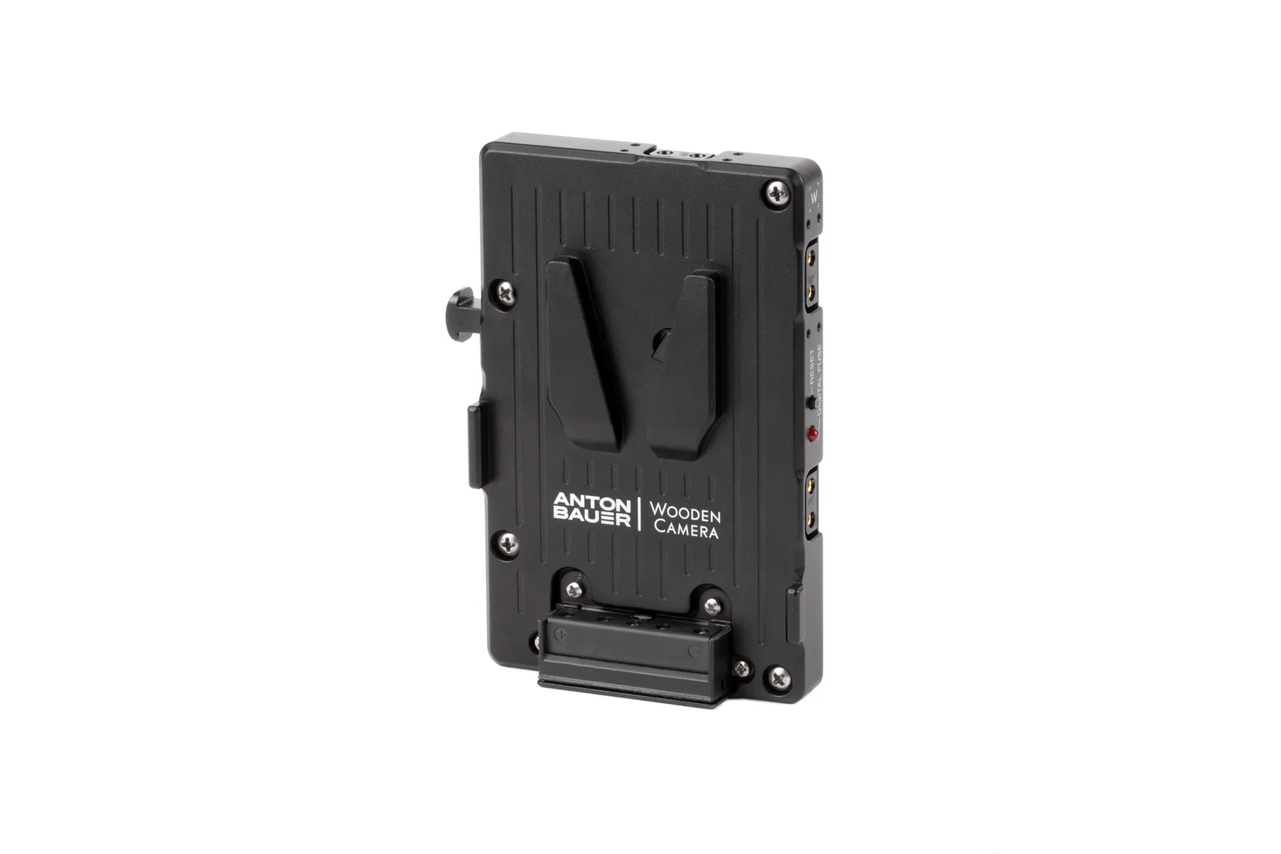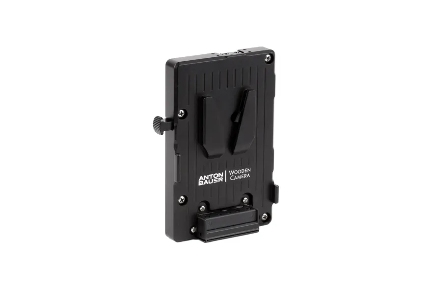 Wooden Camera brand Pro V-Mount plate is a metal power plate, created in partnership with Anton Bauer, and has a rugged aluminum body for durability and secure battery mounting. Features 3x D-Taps for accessory power at battery voltage (12-16V), a digital fuse with reset button, rear cover plate, and captive mounting screws. Should the user exceed the set current for accessories, only the accessory outputs are disabled leaving the camera running normally. Once the current load has been reduced by either removing accessories or reconfiguring, the reset button can be pressed to enable accessory power again.