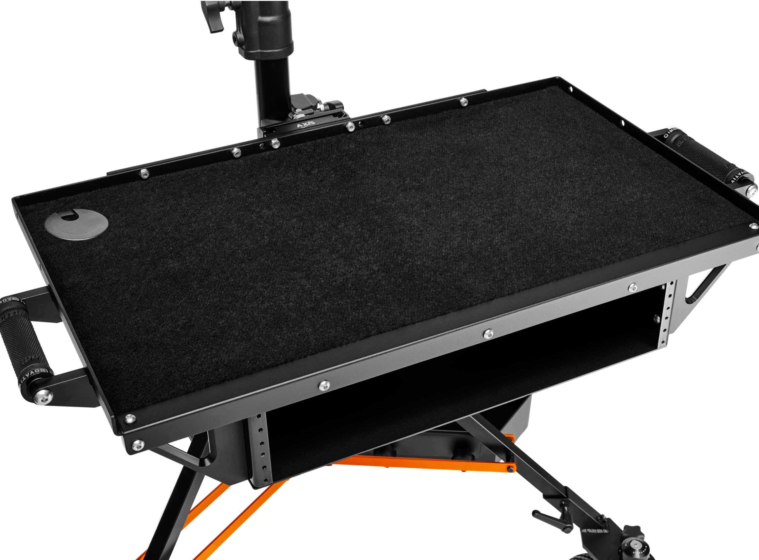 The WorkSurface Pro, when attached to the AXIS Stand, offers versatile positioning options, allowing for height adjustment between 34 in. and 43 in. off the ground, similar to a standing desk. It provides 360-degree rotation around the stand and features a flat top surface with three edges, specifically designed for ergonomic keyboard and mouse access. With convenient handles on both sides, the WorkSurface Pro can be effortlessly carried or relocated. The top shelf is finished with durable outdoor marine carpet and includes a pass-through cable management hole for a tidy workspace.